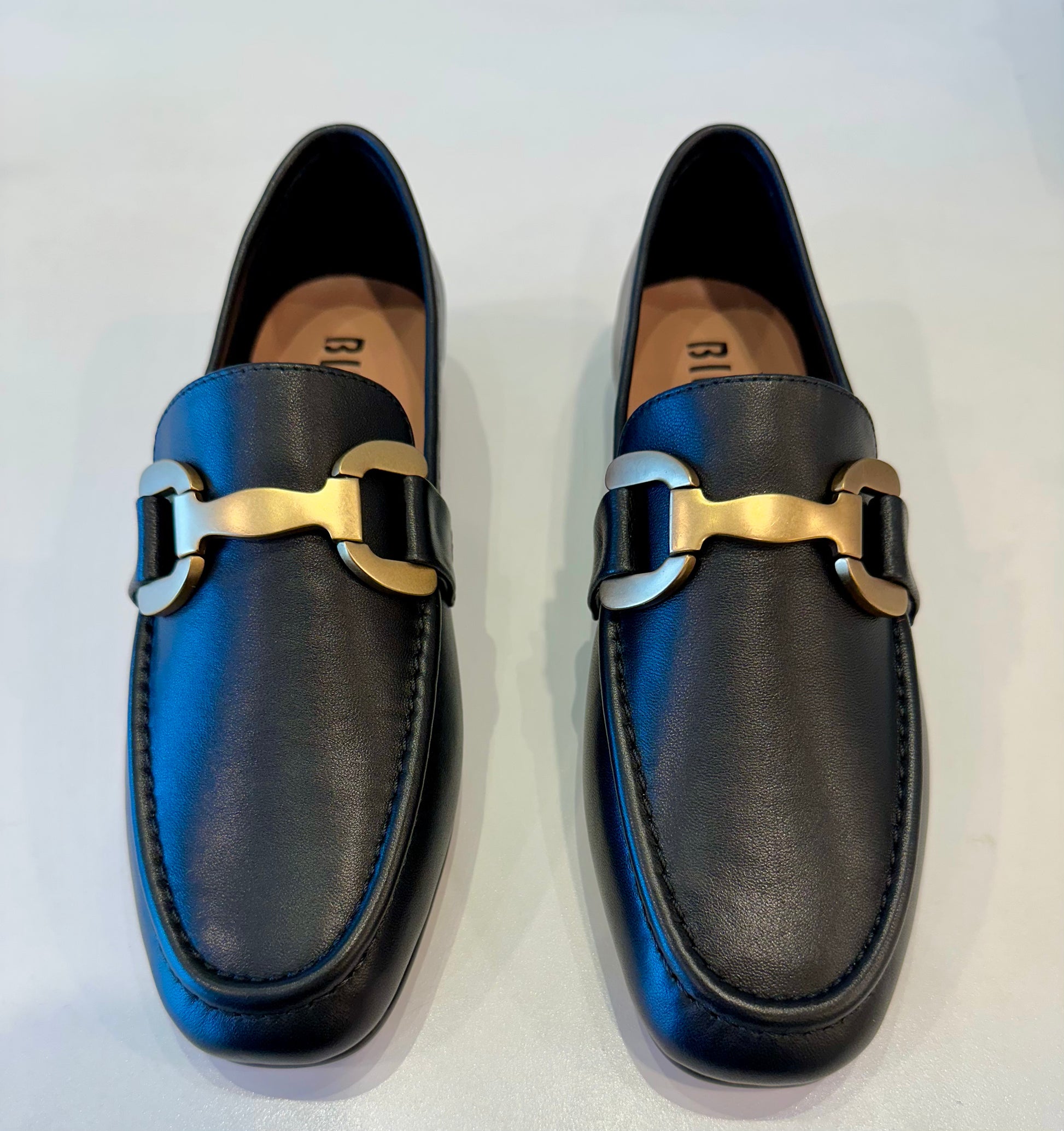 Black flat loafer with a light gold metal buckle detail on the vamp. The Vela Loafer model features a round toe and a 2 cm flat heel.