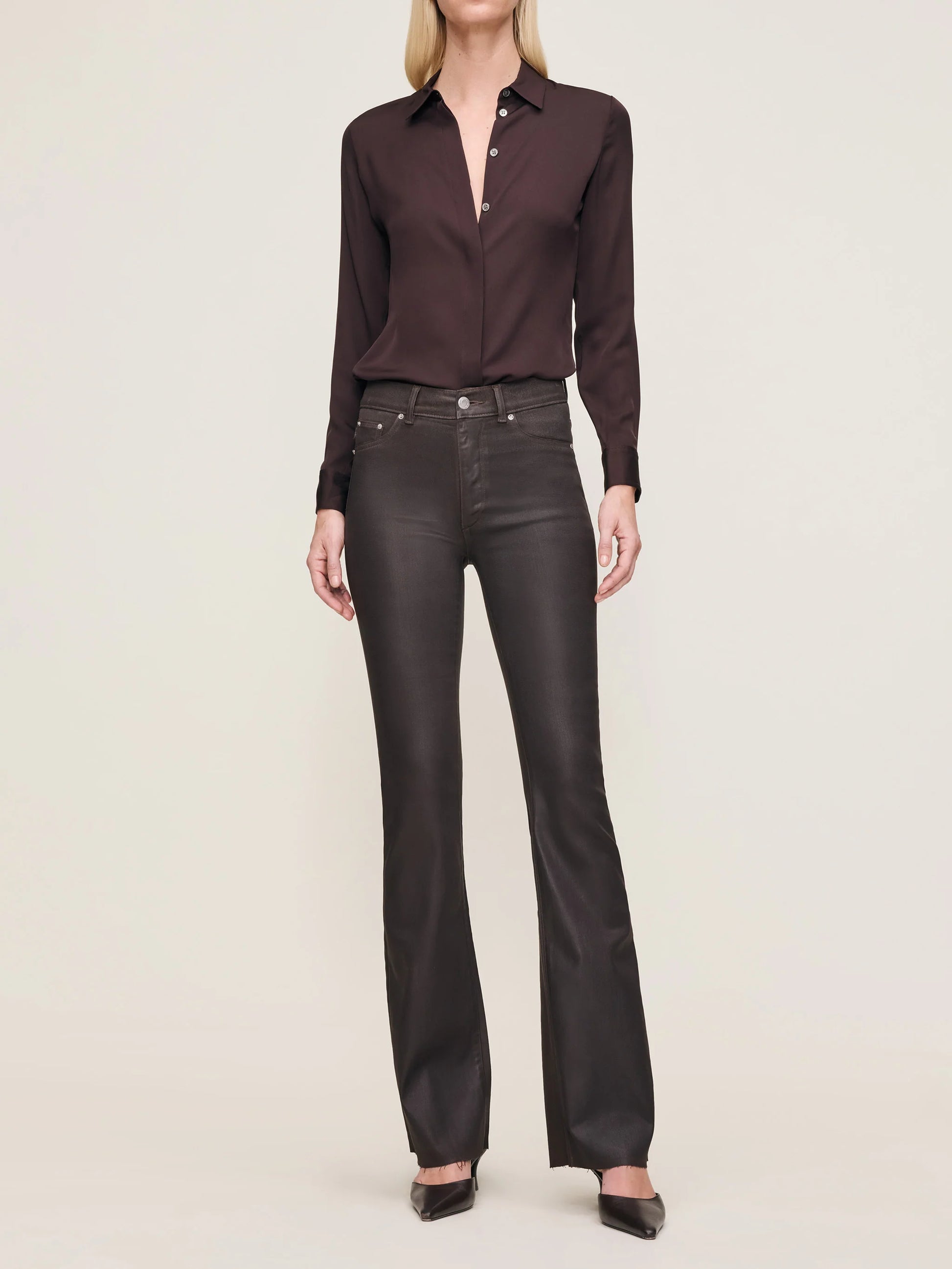 Chocolate Coated is a dark brown coated denim. It features silver hardware, tonal stitching, a raw hem, and a black back patch.