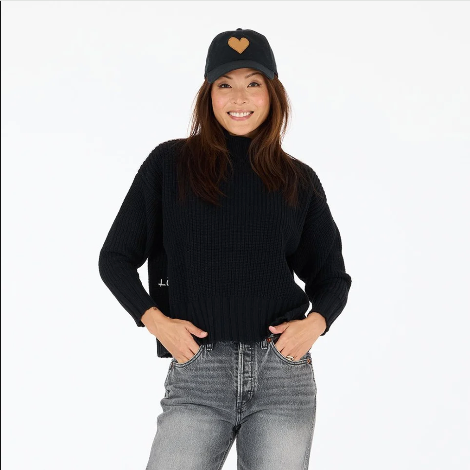 Inspired by timeless fisherman styles, the Marlow Imperfect Heart sweater is a is a rib-knit mock-neck in soft black cotton. It has heart appliqué elbows and loved embroidered on the waistline. The dropped shoulders create a relaxed fit.