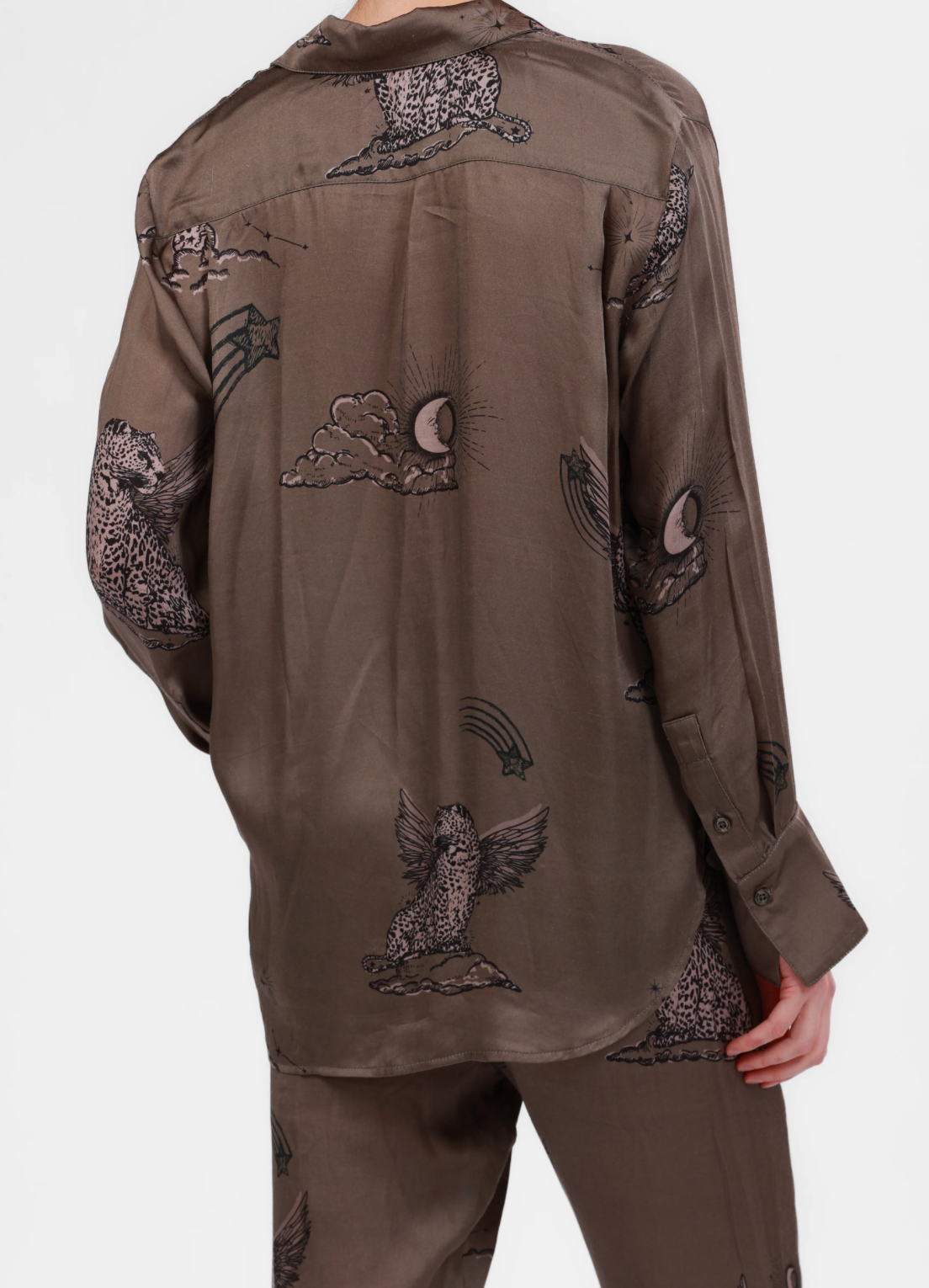 A military green cupro-silk shirt featuring our Astrology print, where winged mythical animals fall in love under a starry sky. Designed to be paired with matching pants in the same fabric and print.