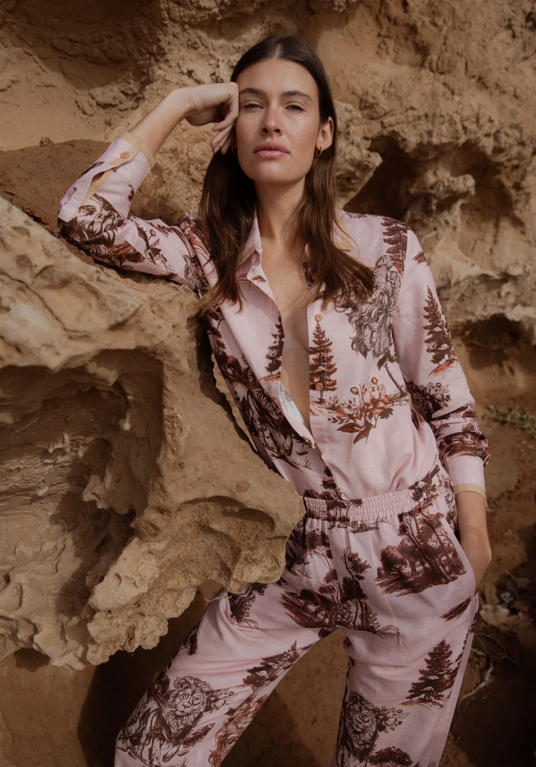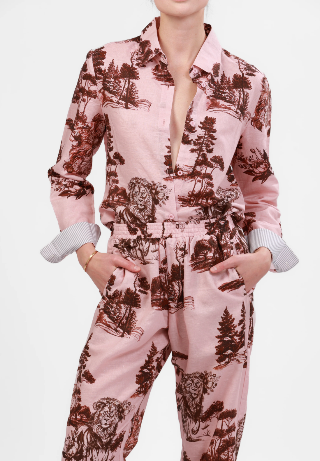 Our timeless classic shirt is reimagined with a vivid, original print in a soft pink hue. Made from our beloved cotton-linen blend, it features a wild landscape of pines, trees, and free-roaming lions—kings in their natural domain.