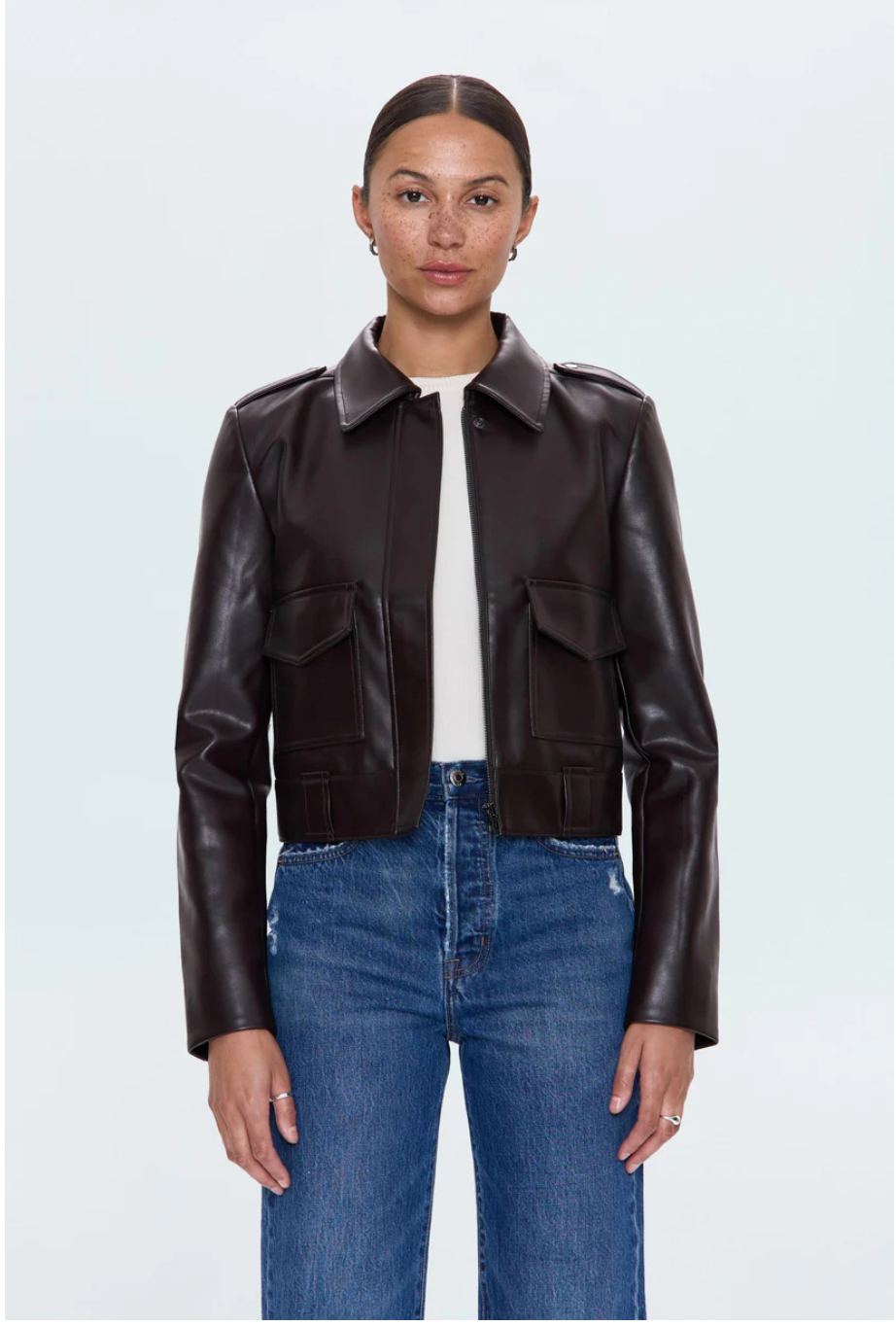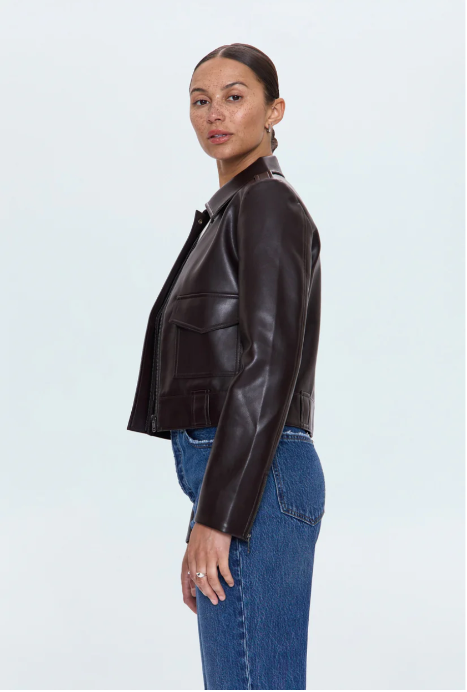 A modern update to the classic leather jacket, Bex is cut with a cropped, shrunken fit that delivers edge without bulk. Designed with a sharp collar, front flap pockets, and sleek lines, it’s crafted from buttery soft alternative leather in French Roast, a deep brown with rich sheen, for a finish that feels both polished and cool.