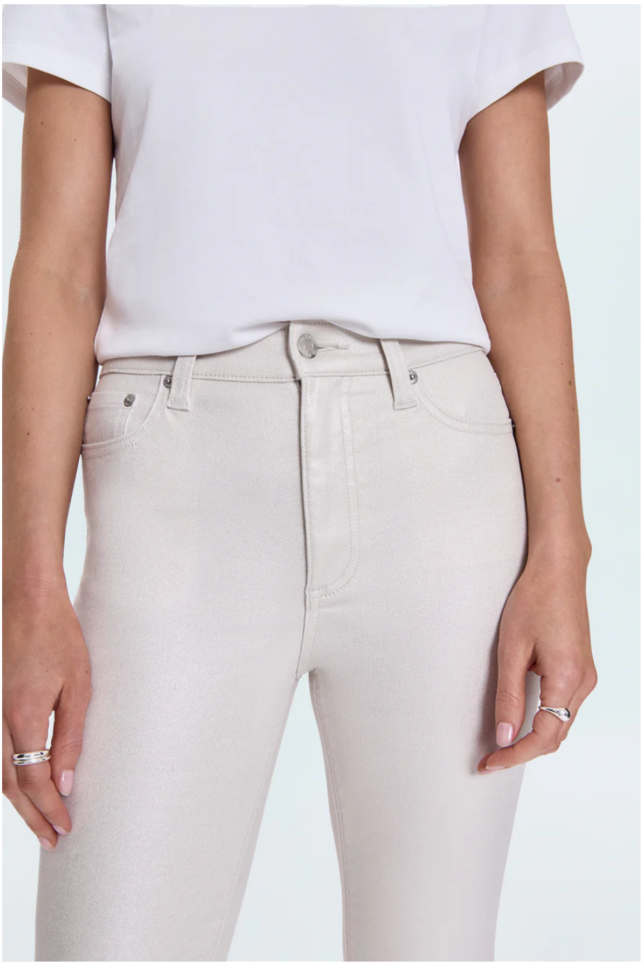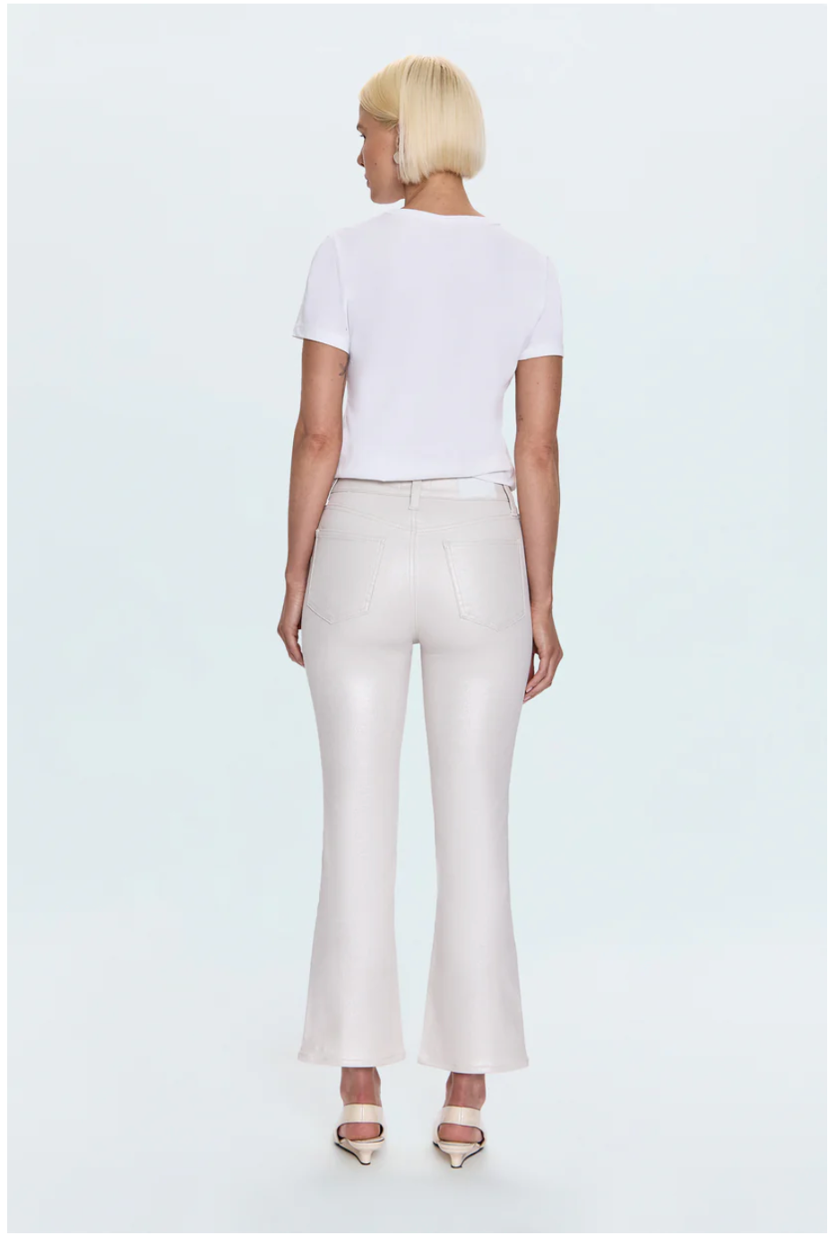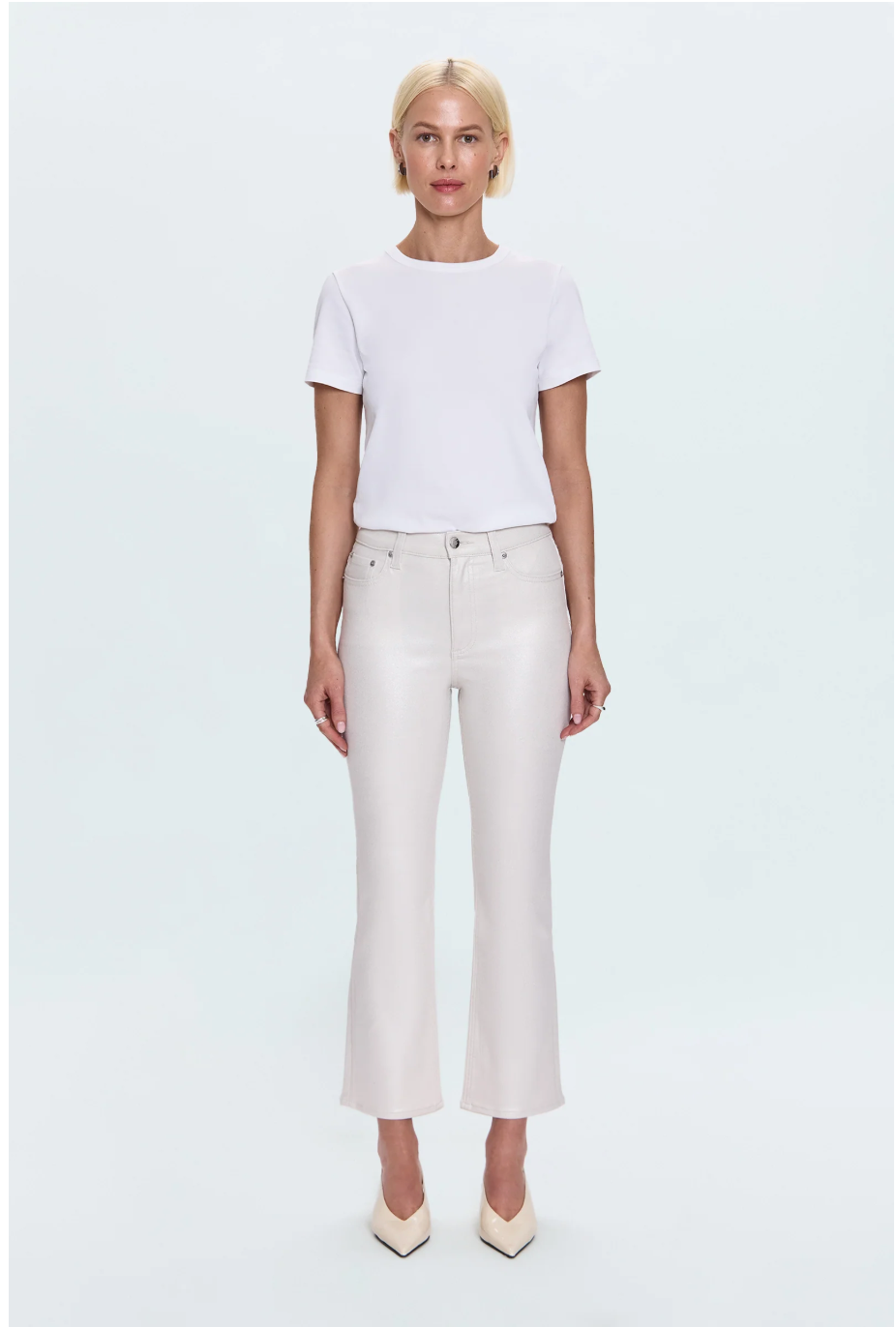 A modern take on the classic bootcut, Lennon features a high rise and slim fit through the hips and thighs before subtly flaring at the calf for balanced proportion. The cropped 27" inseam flatters every shoe, from heels to flats. Crafted from high-stretch fabric in Ivory Luster, a pearly off-white with a sleek coated finish that adds soft sheen and elevated polish