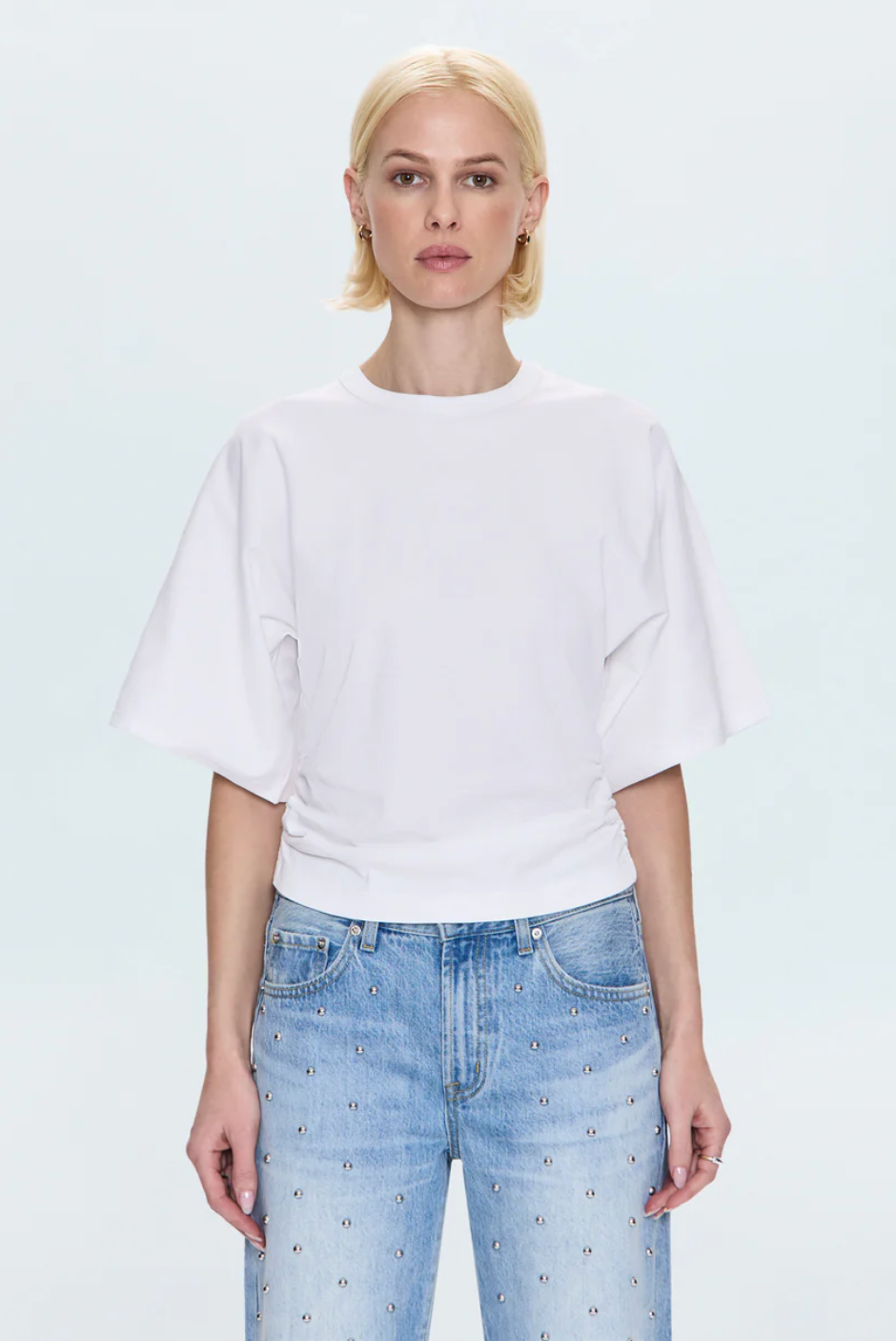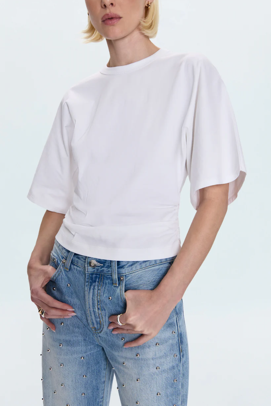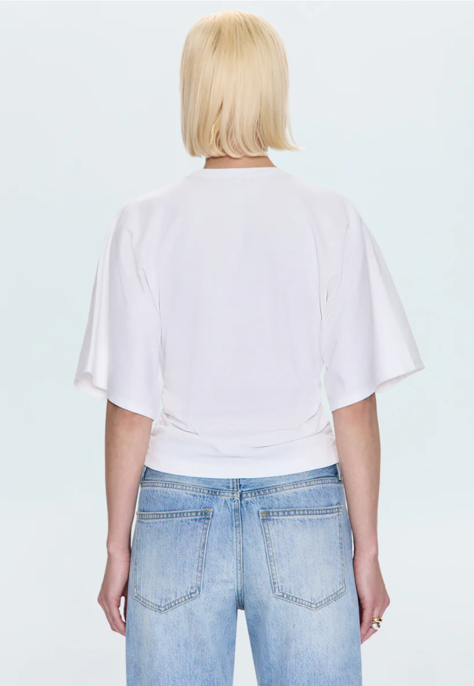 The perfect tee for the season. Veronica delivers a relaxed dolman shape with drop shoulders that transitions to a fitted silhouette through side cinching. The bodycon effect feels intentional, while the shirttail hem adds subtle movement. Crafted from a 100% cotton compact jersey that holds its shape and feels luxuriously soft against the skin. Le Blanc brings crisp white sophistication that elevates any look, great for layering or standing alone.